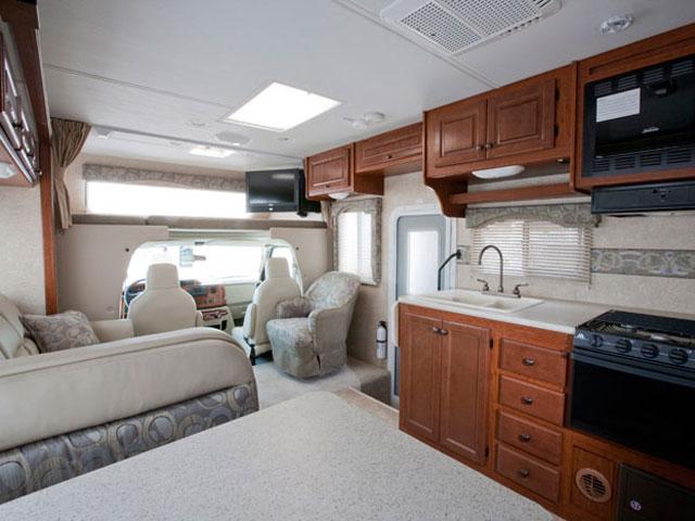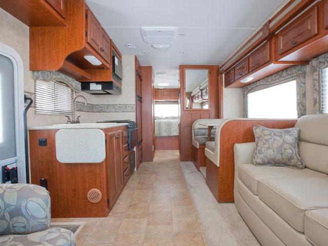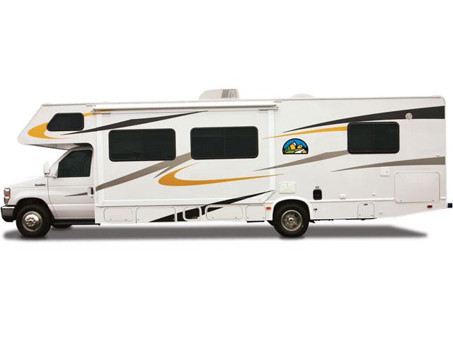 Powered by a V10 engine and automatic transmission with cruise control. AM/FM Radio with CD player, TV/DVD. 4kw Power generator. Cab-over bed (244 x 142cm), a permanent queen size bed (153 x 203cm), the slide out dinette (107 x 185cm) and sofa (104 x 158cm) can be converted into 2 double beds. With the cab-over design and slide out feature this vehicle gives you the flexibility options for your bed configuration and a spacious living area.