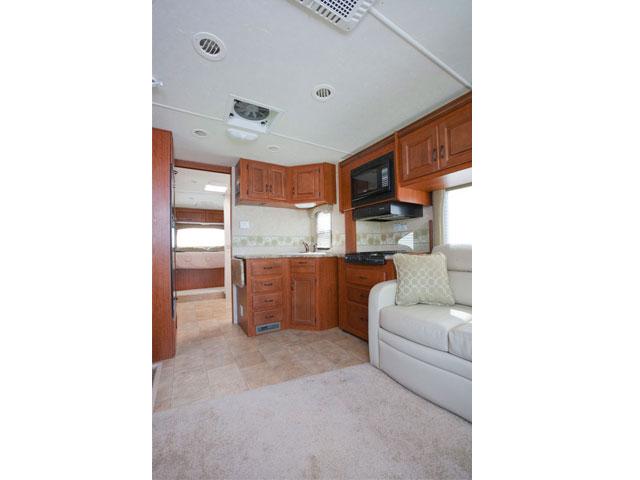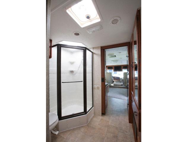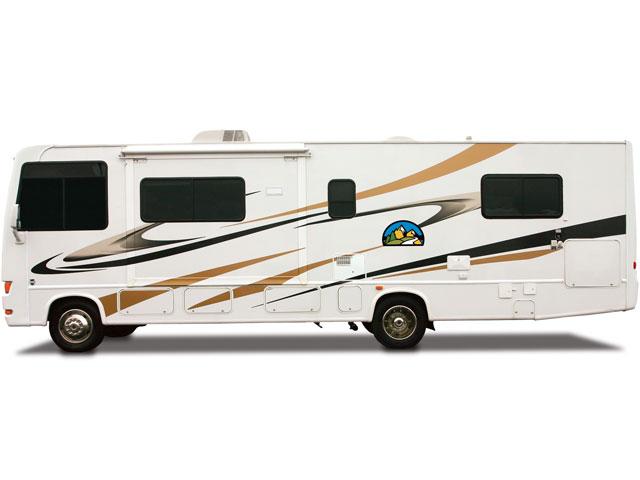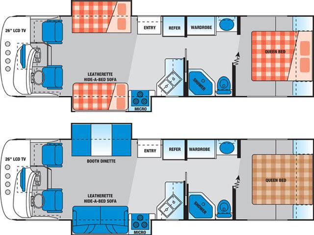 Powered by a V10 engine and automatic transmission with cruise control. AM/FM Radio with CD player, TV/DVD. 3 burner stove and a microwave oven, sink , two way Fridge with Freezer, Furnace, Water Heater, a Toilet and Shower, and 4kw Power Generator. Permanent Queen size bed (153 x 190cm) at the back, the slide-out dinette (94 x 173cm) and sofa (137 x 183cm) can be converted into two double beds.